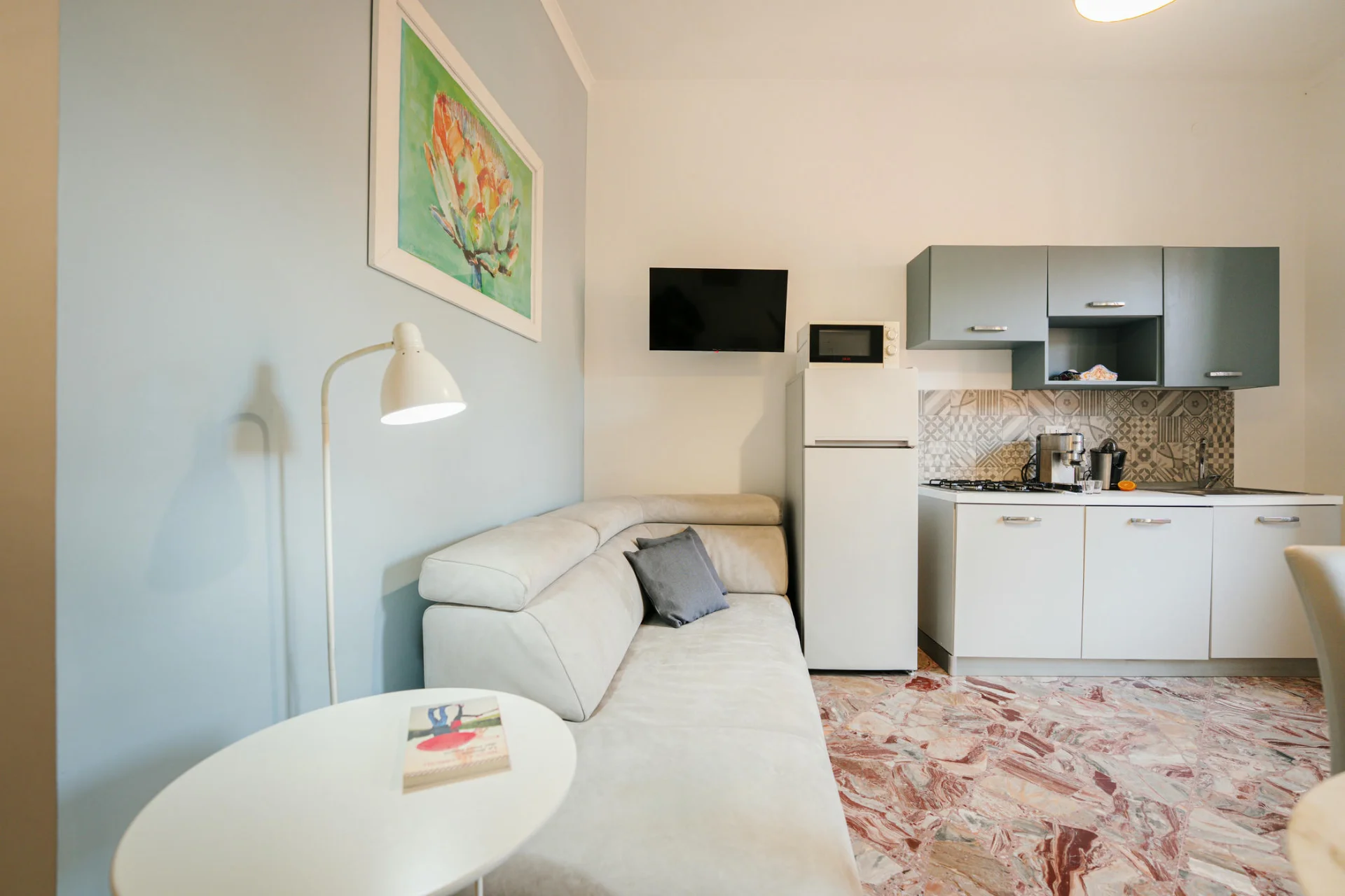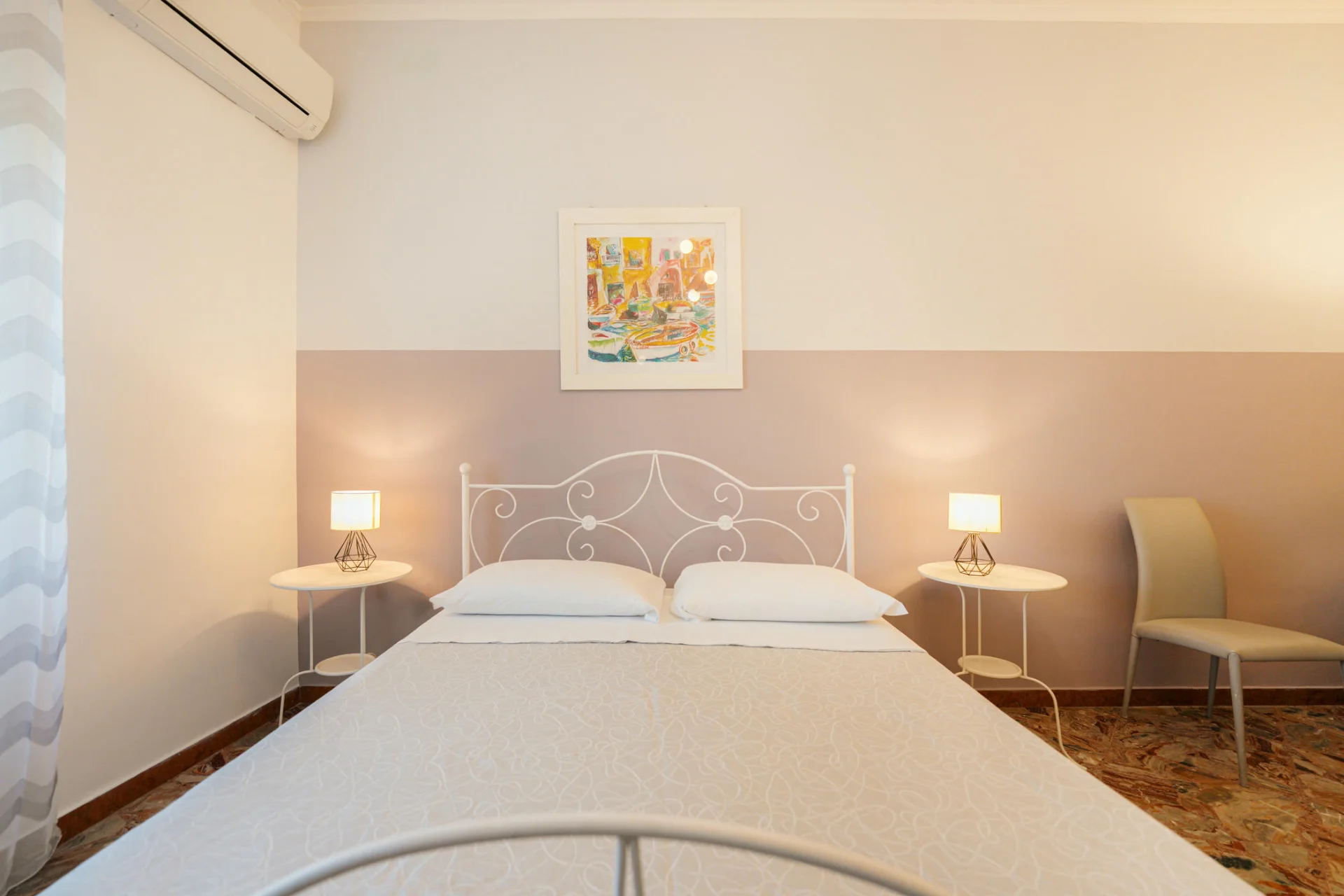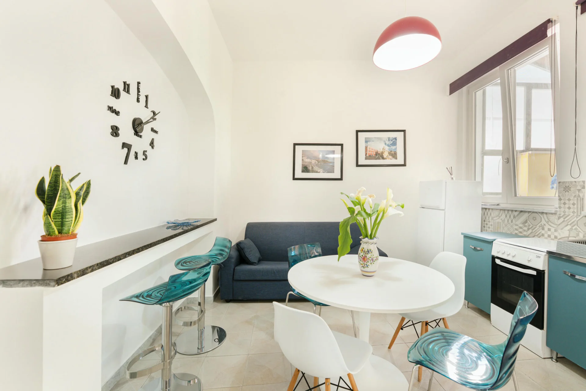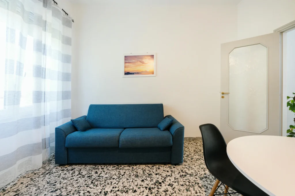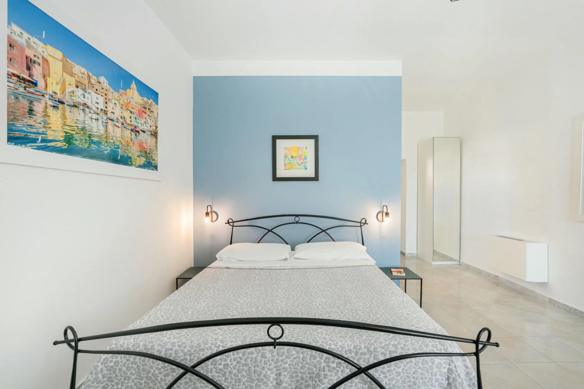 The flat consists of a kitchen/living room with sofa bed, a large bathroom and a very pretty double bedroom with a large balcony from which you can see the sea and the island of Ischia. All basic equipment is included. The flat has wi-fi internet, air conditioning, TV and washing machine.